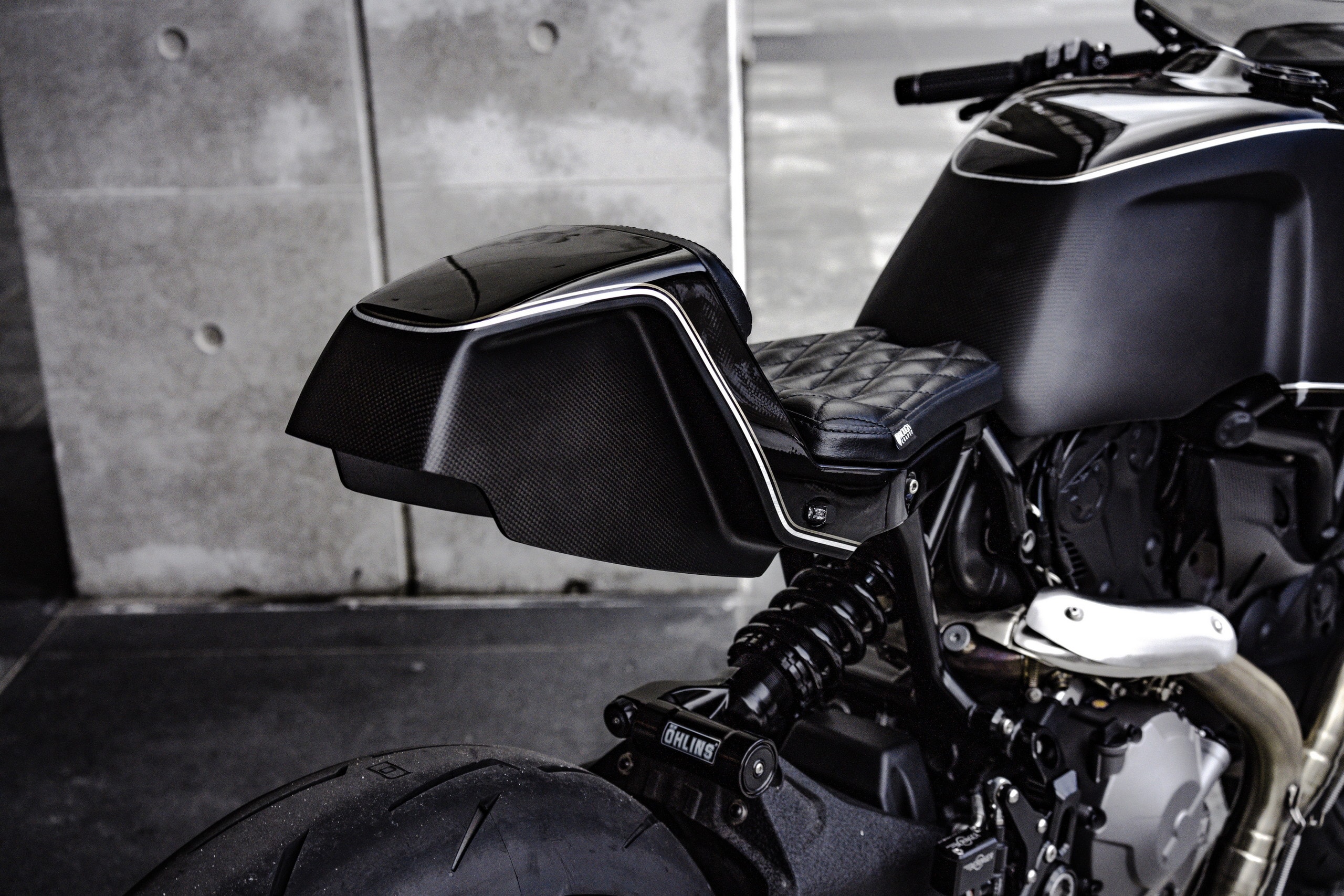 With the donor back at the shop and fully dismantled, Winston began by replacing its original subframe with a billet aluminum substitute made from scratch. It tightens up the Monster’s rear end considerably, while supporting a 3D-printed tail section with multi-function LEDs attached to it left and right. A custom two-piece saddle is also present in that area, featuring black leather upholstery and diamond pattern stitching.