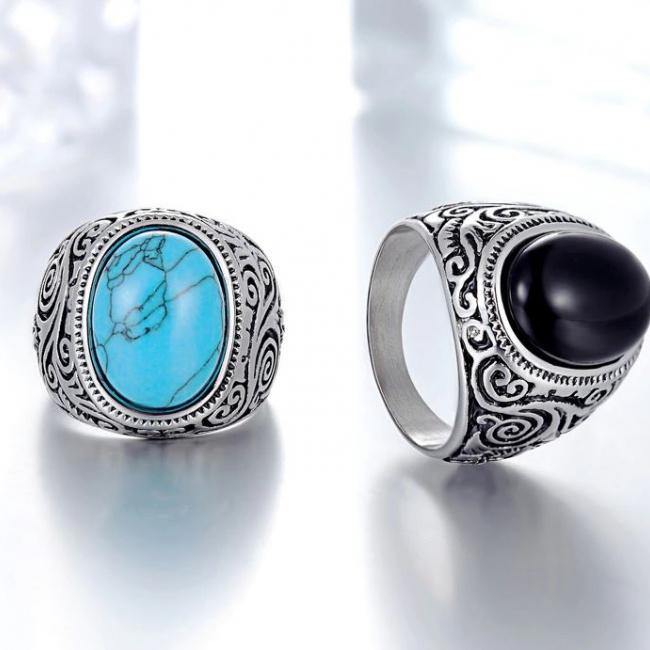 Stainless Steel Turquoise/Black Onyx Tibet Style Biker Rings