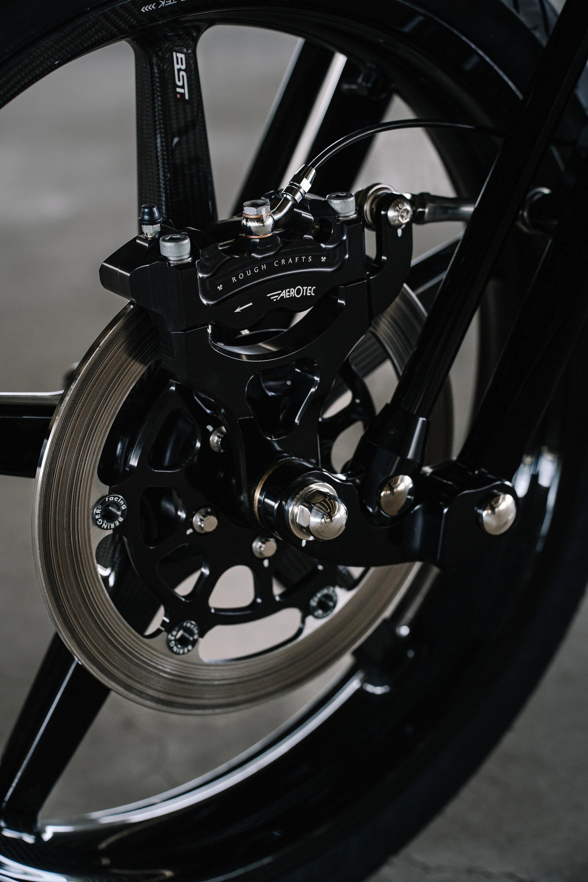 There we find a new monoshock from Progressive Suspension, taking the Softail’s handling to an entirely new level. Unsprung territory has also undergone some radical changes, with five-spoke carbon fiber hoops from BST replacing the original footwear. They measure 21 inches in diameter at the front and 17 inches at the back, both shod in Pirelli rubber for plentiful grip. Rough Crafts went to town once again with the brakes.