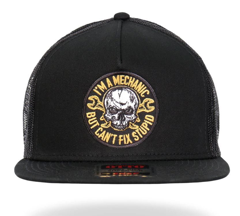 This hat features a black, white and yellow patch reading "I'm A Mechanic But I Can't Fix Stupid".